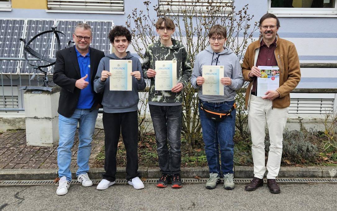 Die Schüler Philipp Brehm, Leander Groh und Leonhard Stangl aus der Klasse 8B, im Bild flankiert von dem Schulleiter OStD Thomas Carl und dem Beauftragten für Begabtenförderung StD Matthias Bergmann, haben sehr erfolgreich an der ersten Runde des Landeswettbewerbs Mathematik teilgenommen.