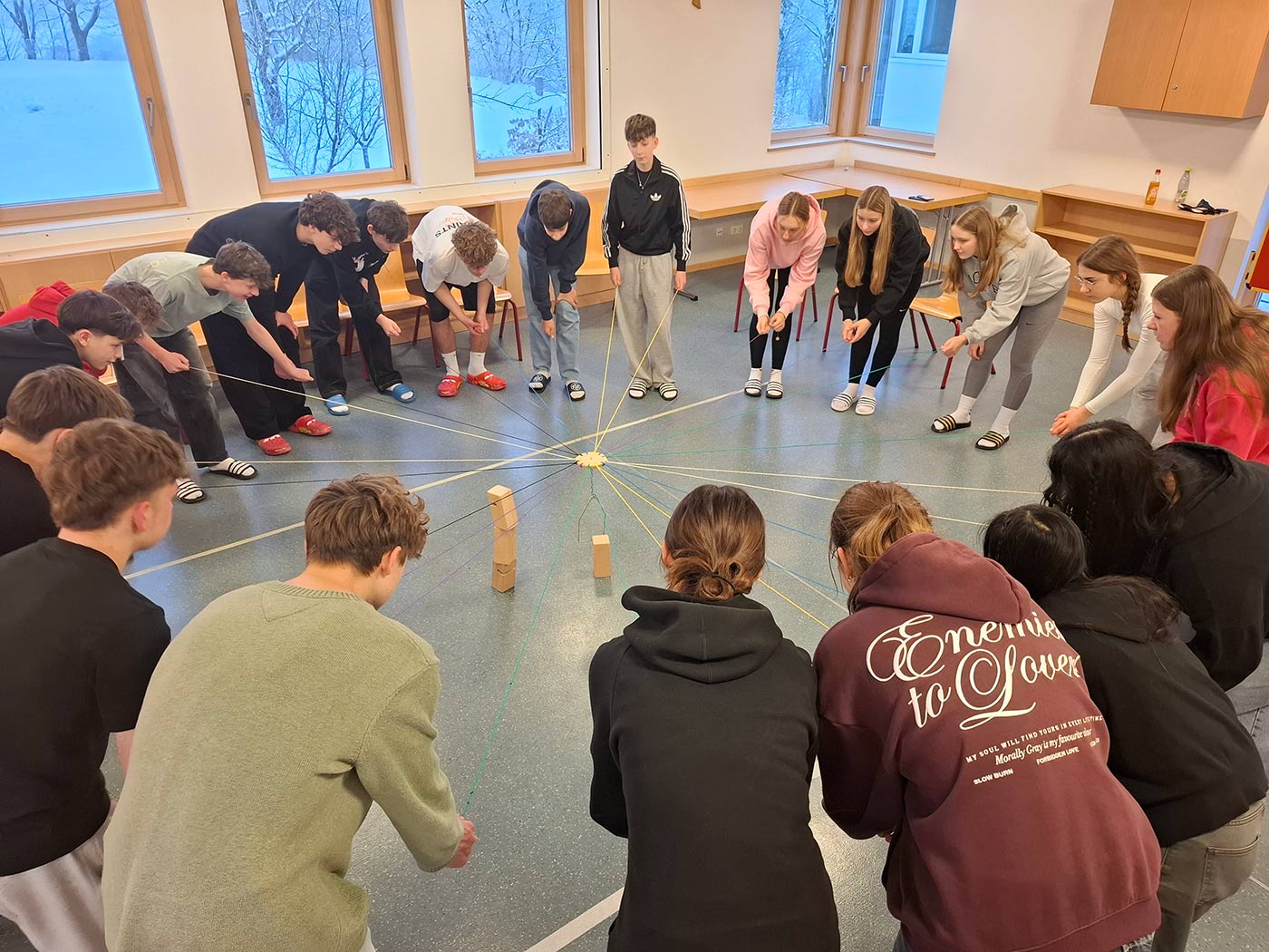 Das Haus am Knock, das die Gruppen ganz für sich allein hatten, bot ideale Bedingungen: viel Raum für Gespräche, gemeinsames Spielen z.B. in der Kellerkneipe, Nachdenken und natürlich jede Menge Spaß. Neben Billard, Kicker und Tischtennis sorgten auch verschiedene Gruppenaktivitäten für gute Stimmung und stärkten das Gemeinschaftsgefühl. Besonders gut Weg kam in der abschließenden Feedbackrunde die 40-Minuten-Challenge. Aber auch Kooperationsspiele wie der „Whiskeymixer“, das „Zugfahren“ oder das „Rückenstärken“ sorgten für gute Unterhaltung oder tiefgründiges Nachdenken. In diesem Jahr wählten alle Klassen das Thema „Klassengemeinschaft stärken“, was zeigt, worin die wahren Bedürfnisse unserer Jugendlichen liegen.